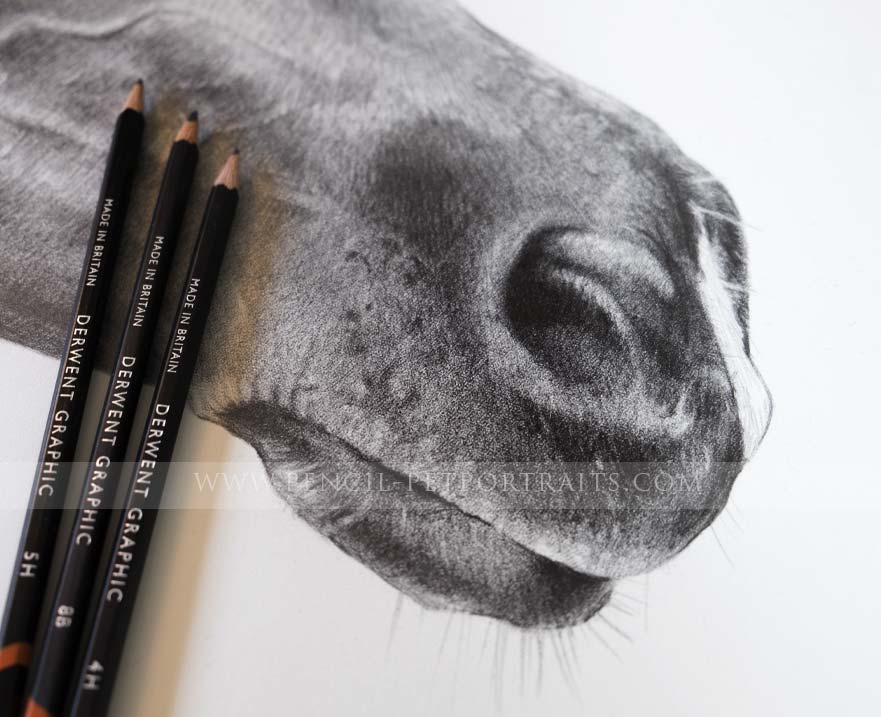 Welcome to my pencil horse portrait of Flash, a stunning memorial commission for a returning client in Australia. Jo had previously commissioned some dog portraits, and this time she asked me to create a large-scale pencil drawing of her beloved horse Flash, who had sadly passed away. The final artwork measured 30 x 40 inches—one of the largest sizes I offer—and was drawn by hand using graphite pencil on Italian Fabriano paper, making it a true centerpiece and a lasting tribute. It was an honor to work on such a meaningful portrait; scroll down to see photos.